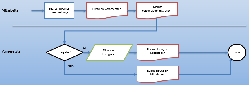 Sind im Haus Zeiterfassungssysteme wie elektronische Stechkarten oder Chipping-Terminals im Einsatz, kann es auch zu einer fehlerhaften Erfassung, beispielsweise bei Stromausfall am Erfassungsterminal, der Kommen- und Gehenzeiten kommen. Das Ergebnis ist dann eine Nichterfassung des Dienstbeginns oder des Dienstendes. Für diesen Fall muss die fehlende Zeitkomponente nachgetragen werden können. Soll dies im Rahmen eines formalisierten Prozesses erfolgen, ist dieser Workflow sinnvoll.